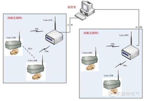 (1)如上圖所示,以Zigbee網(wǎng)關為KJT-SmartWireless無線主控節(jié)點,結(jié)合無線閥門裝置,共同組建了無線Mesh網(wǎng)絡,實現(xiàn)了數(shù)據(jù)的互聯(lián)互通,并以以太網(wǎng)的方式匯聚到監(jiān)控室。